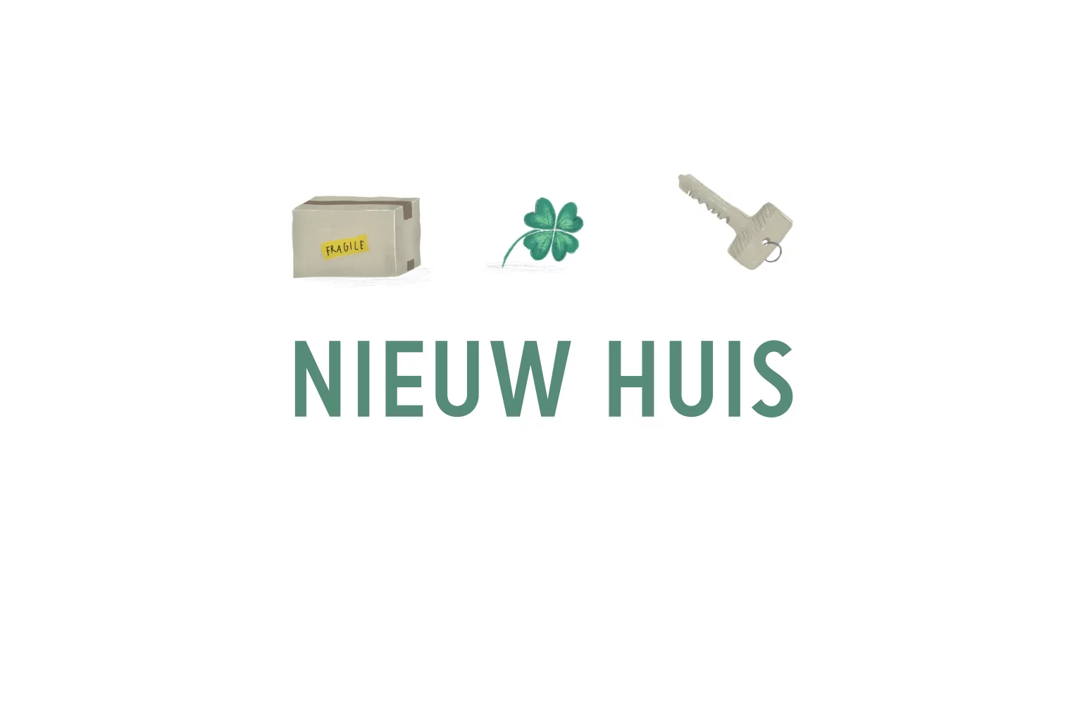 Wenskaartje voor een nieuw huis met een sleutel, verhuisdoos en klavertje vier voor geluk. Je kunt je eigen tekst in de binnenzijde zetten.